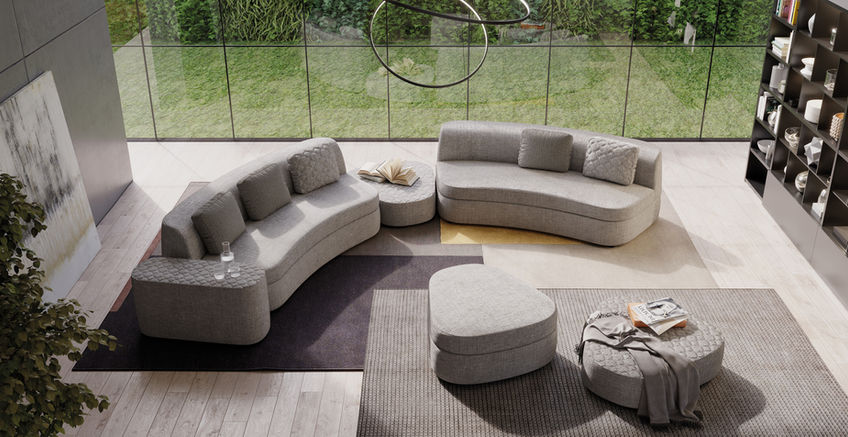 一款弧形組合沙發床,造型流暢優雅。這款曲線轉角沙發床包括固定沙發和沙發床模組、底座、異型坐墊凳和扶手,可根據可用空間相互組合。專為大房間設計,可放置在客廳中央或靠牆放置。有四種尺寸可供選擇,並配有不同的可拆卸蓋子。沙發床版本包含一個200公分長的床墊。